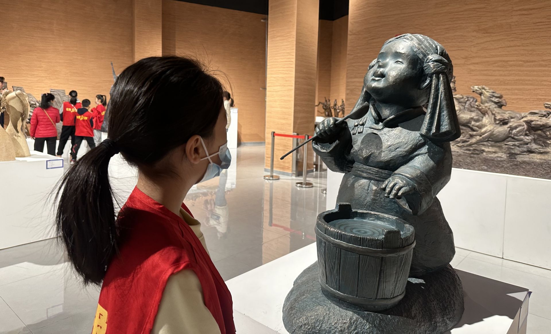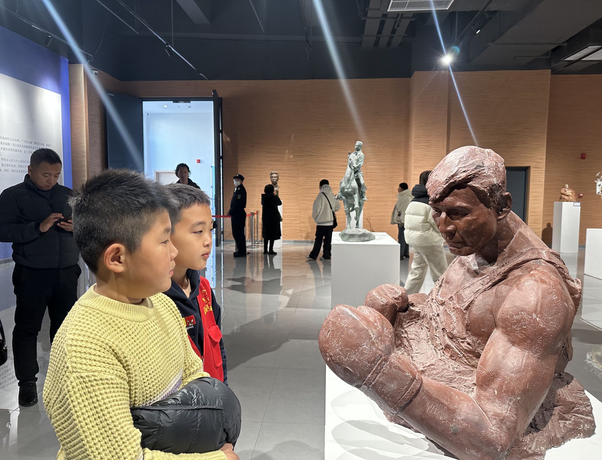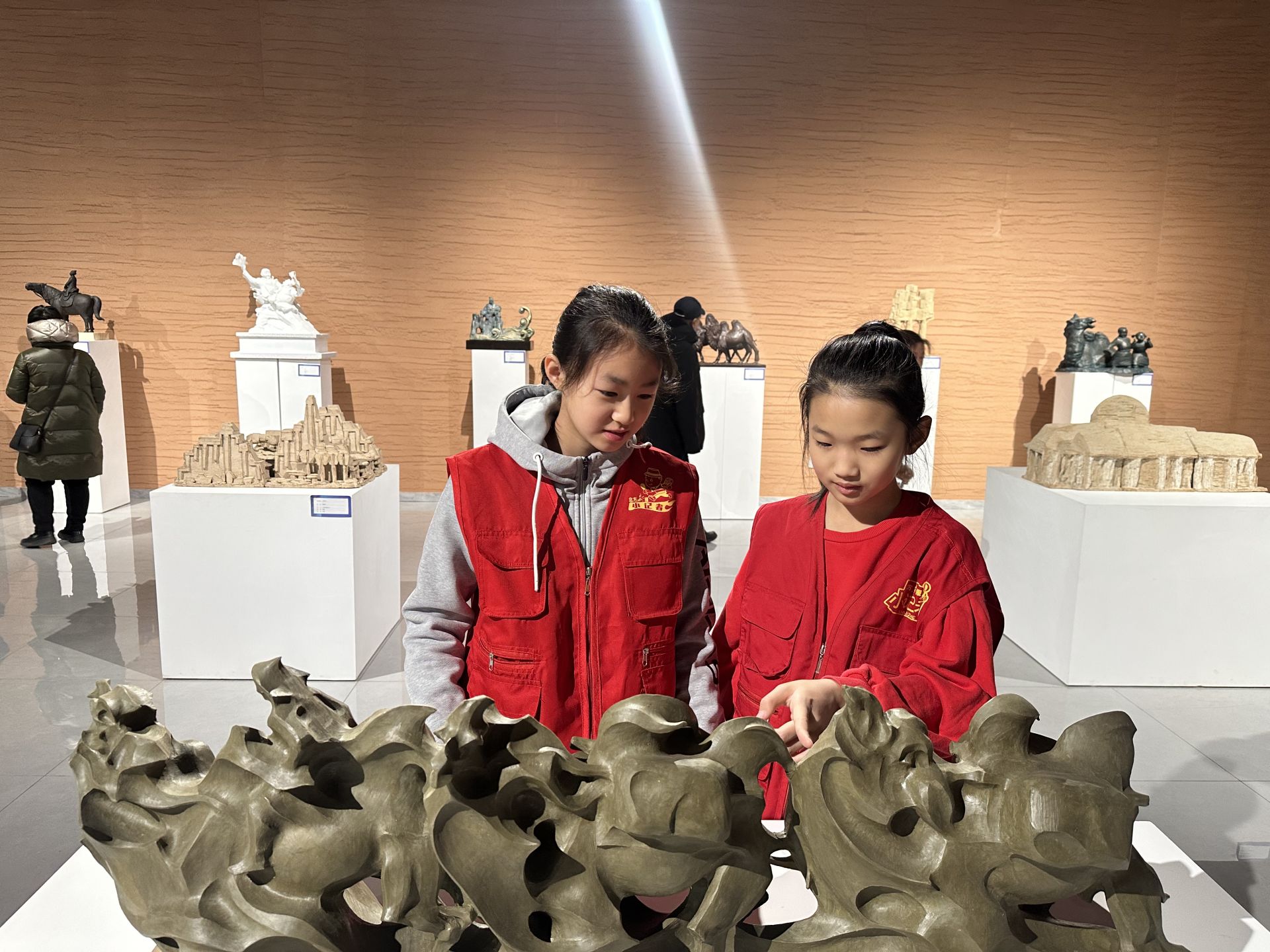當(dāng)日9時(shí)30分,走進(jìn)雕塑館大廳,小記者們被一座座形態(tài)各異、造型多樣的雕塑所吸引。面對(duì)展出的優(yōu)秀作品,小記者和家長(zhǎng)們深感學(xué)習(xí)不僅在課本,更在書本之外。跟隨講解員的腳步,小記者和家長(zhǎng)們參觀了“藝術(shù)經(jīng)典 時(shí)代交響”“文明之境 映照相輝”“中華文化 博大和合”三個(gè)篇章的雕塑作品和藝術(shù)節(jié)期間同步開設(shè)的“守望北疆”內(nèi)蒙古雕塑藝術(shù)展廳,切身感受不同文明間的交流互鑒和優(yōu)秀傳統(tǒng)文化的絢爛多彩。